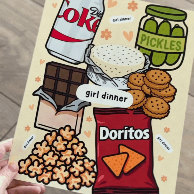A playful ode to every chaotic, cozy, and downright iconic “girl dinner.” From snacks for supper to fridge-door grazing, this art print celebrates the beauty of throwing together whatever looks good on the plate — no rules, just vibes. Perfect for your kitchen, dining nook, or gallery wall as a wink to your inner snack queen.