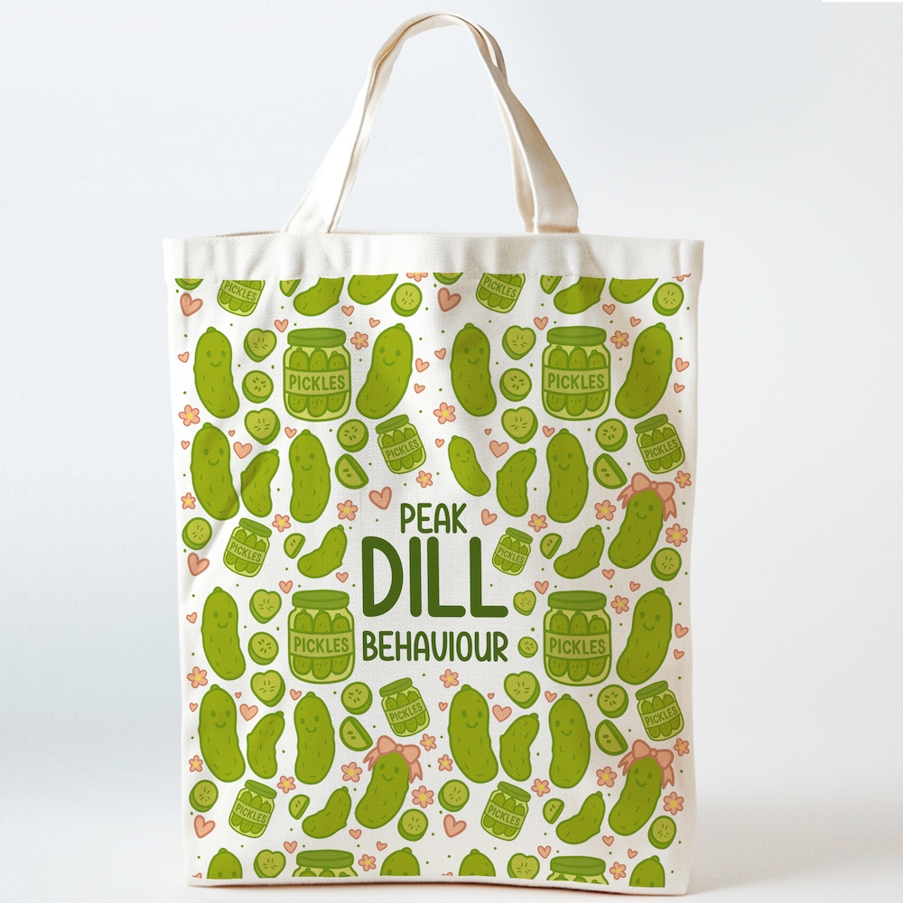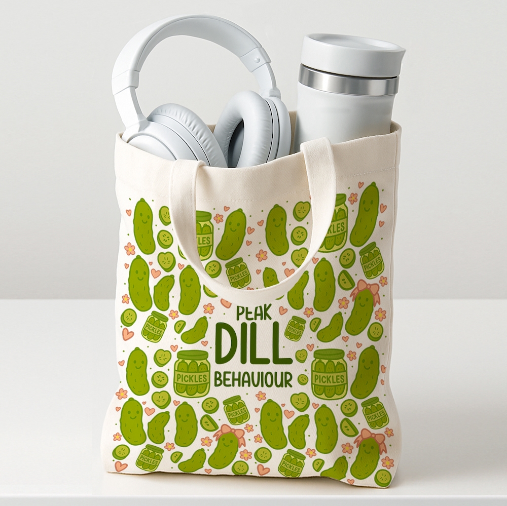 For the girlies (and unhinged dill disciples) who treat pickles like a full personality trait—this tote is your moment. Covered in smug little pickles, jars, hearts, and enough green chaos to scare a cucumber straight, it proudly declares your peak dill behaviour to everyone within a 10-foot radius. Use it for groceries, errands, or simply to warn the world that you cannot—and will not—be stopped.