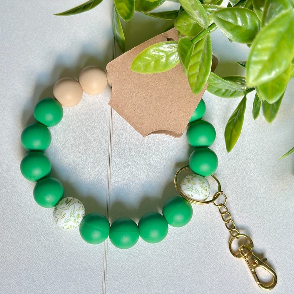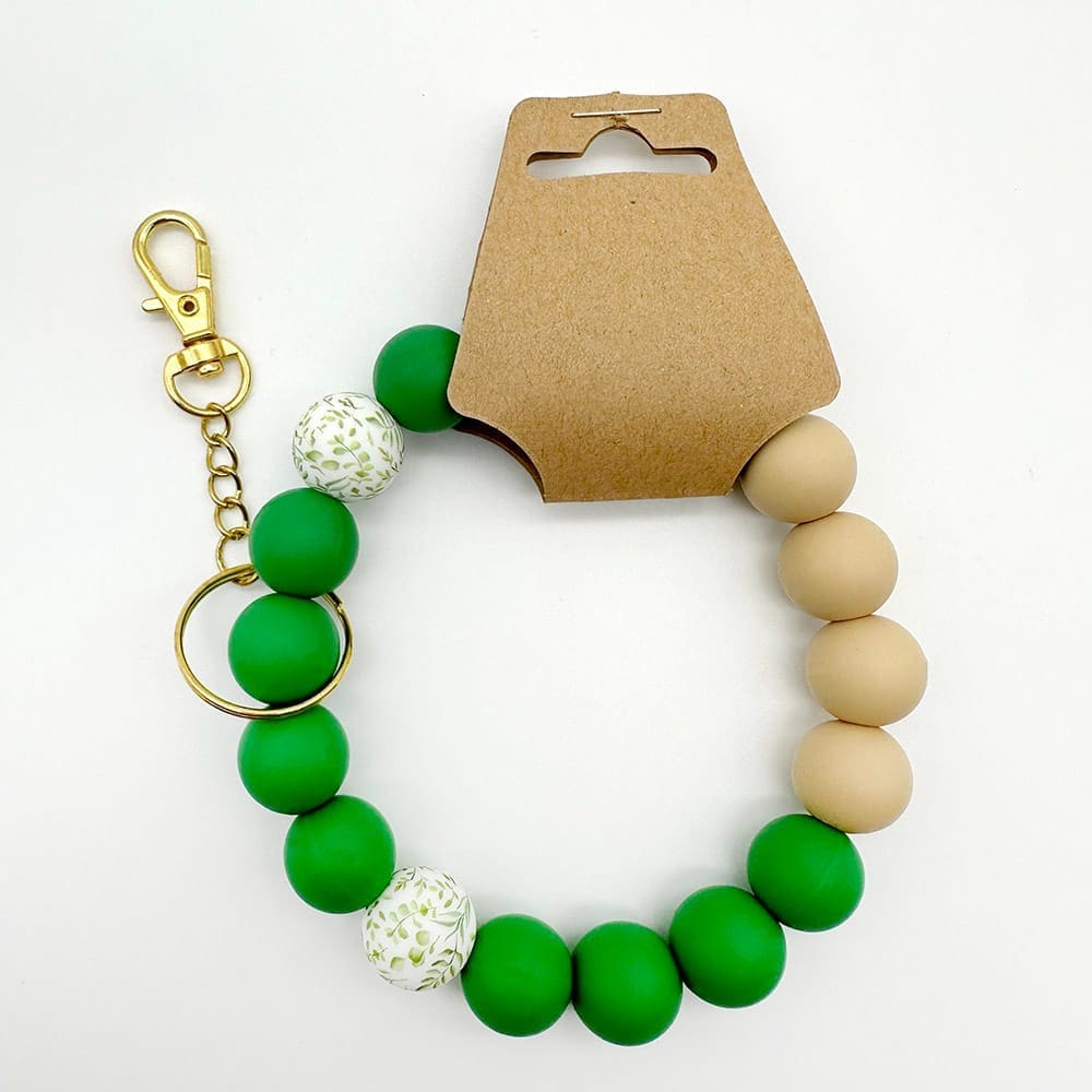 Made from green and beige silicone beads featuring tropical leaves focal beads. Perfect for beach lovers who just want to be reminded of the sand they left behind in Mexico. Sleek and functional, crafted from soft silicone beads with a gold keyring and clasp. Simply attach your keys and wear it hands-free.