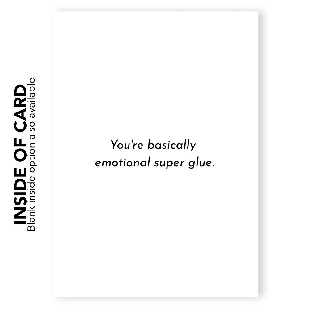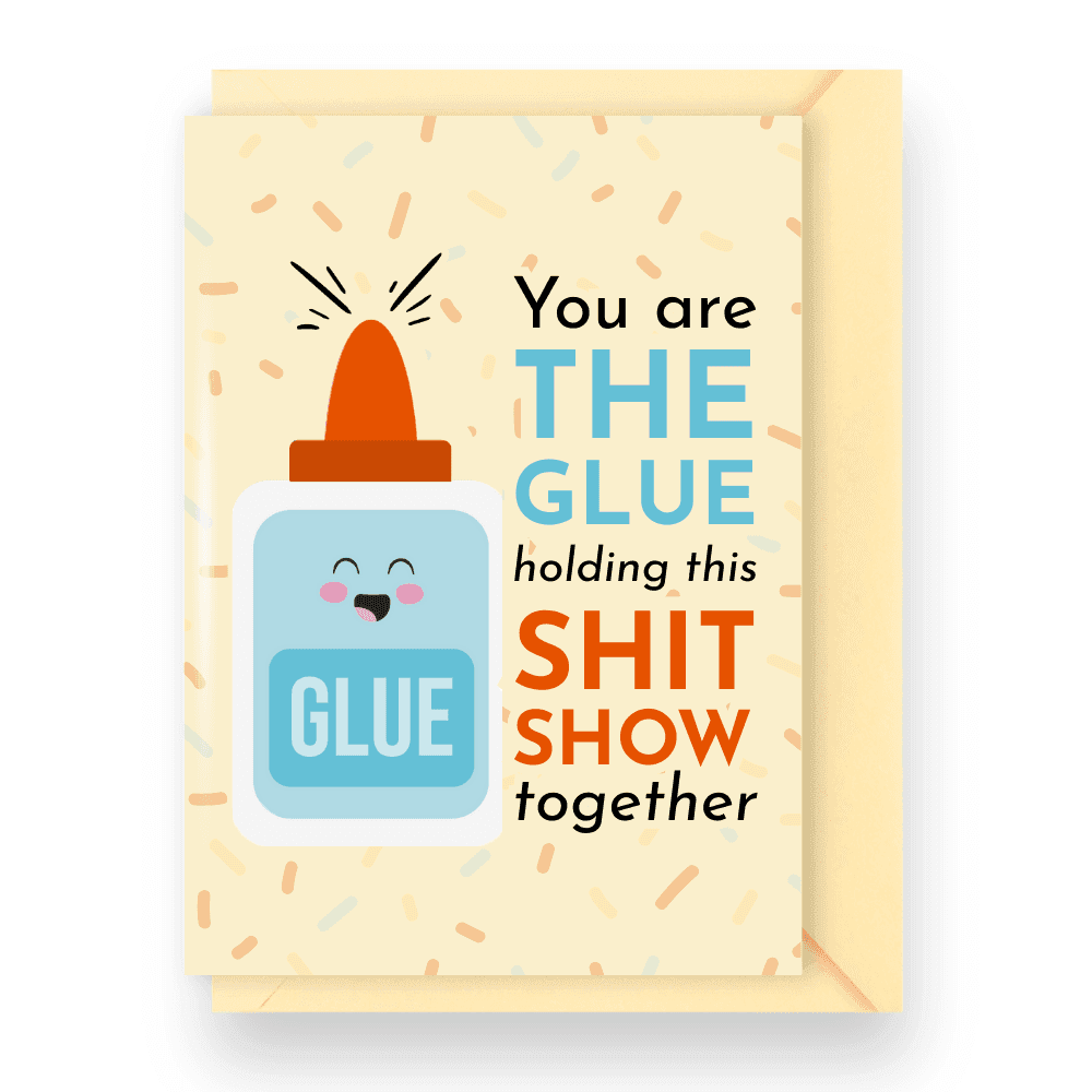 Send a hilarious and adorable message with this kawaii-style greeting card that says, “You’re the glue holding this shit show together.” It’s perfect for anyone who keeps everything running smoothly with humour and heart.
